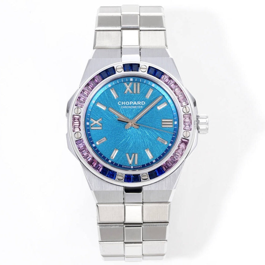 The Chopard Alpine Eagle Summit is a luxurious Swiss timepiece that combines sporty elegance with high-end gem-setting artistry. Featuring a Zinal Blue dial and a bezel adorned with baguette-cut blue and purple sapphires, this watch showcases Chopard’s expertise in both design and craftsmanship. Powered by a precise Swiss movement and finished with exquisite detailing, it’s a statement piece for collectors and enthusiasts who appreciate bold, colorful luxury watches.