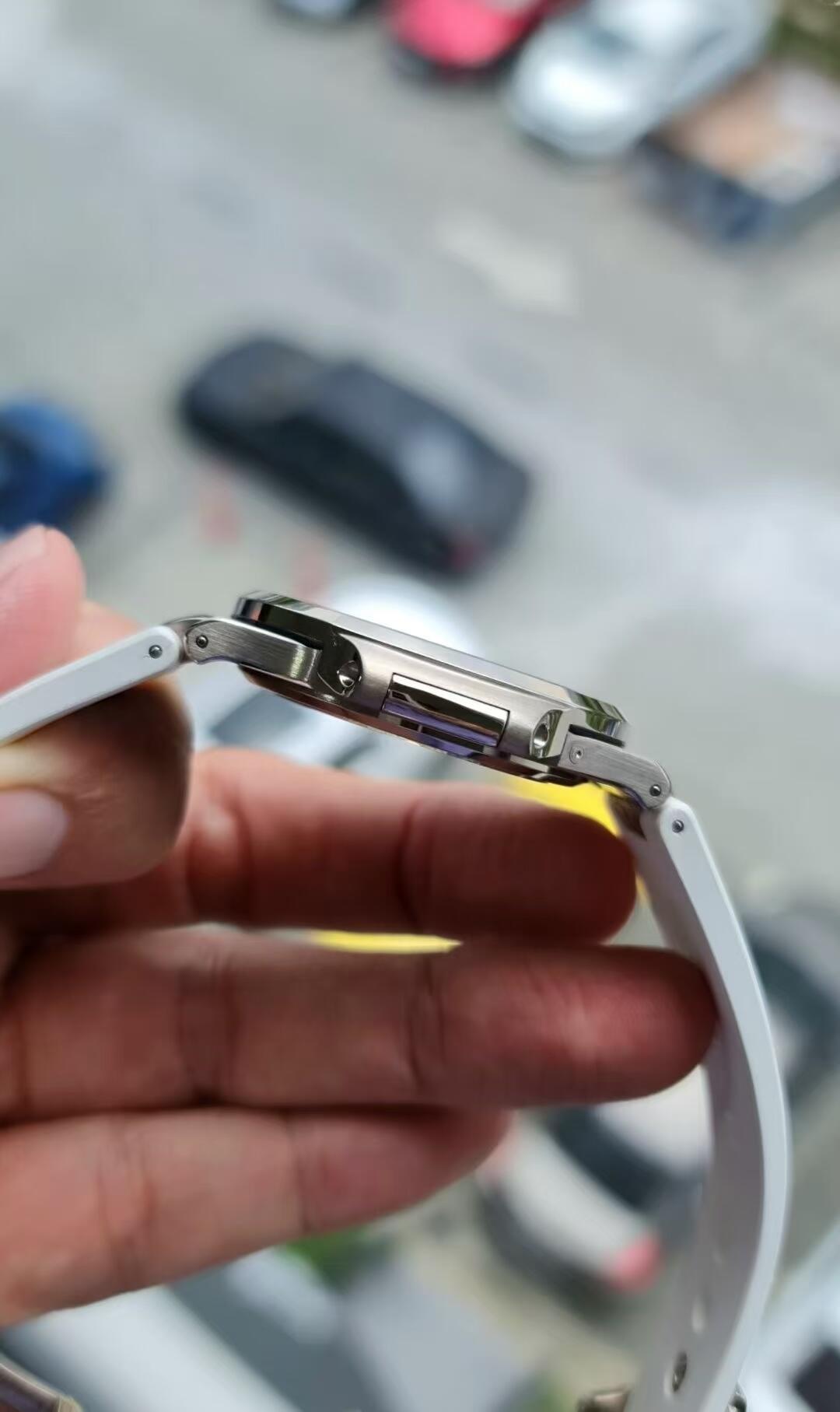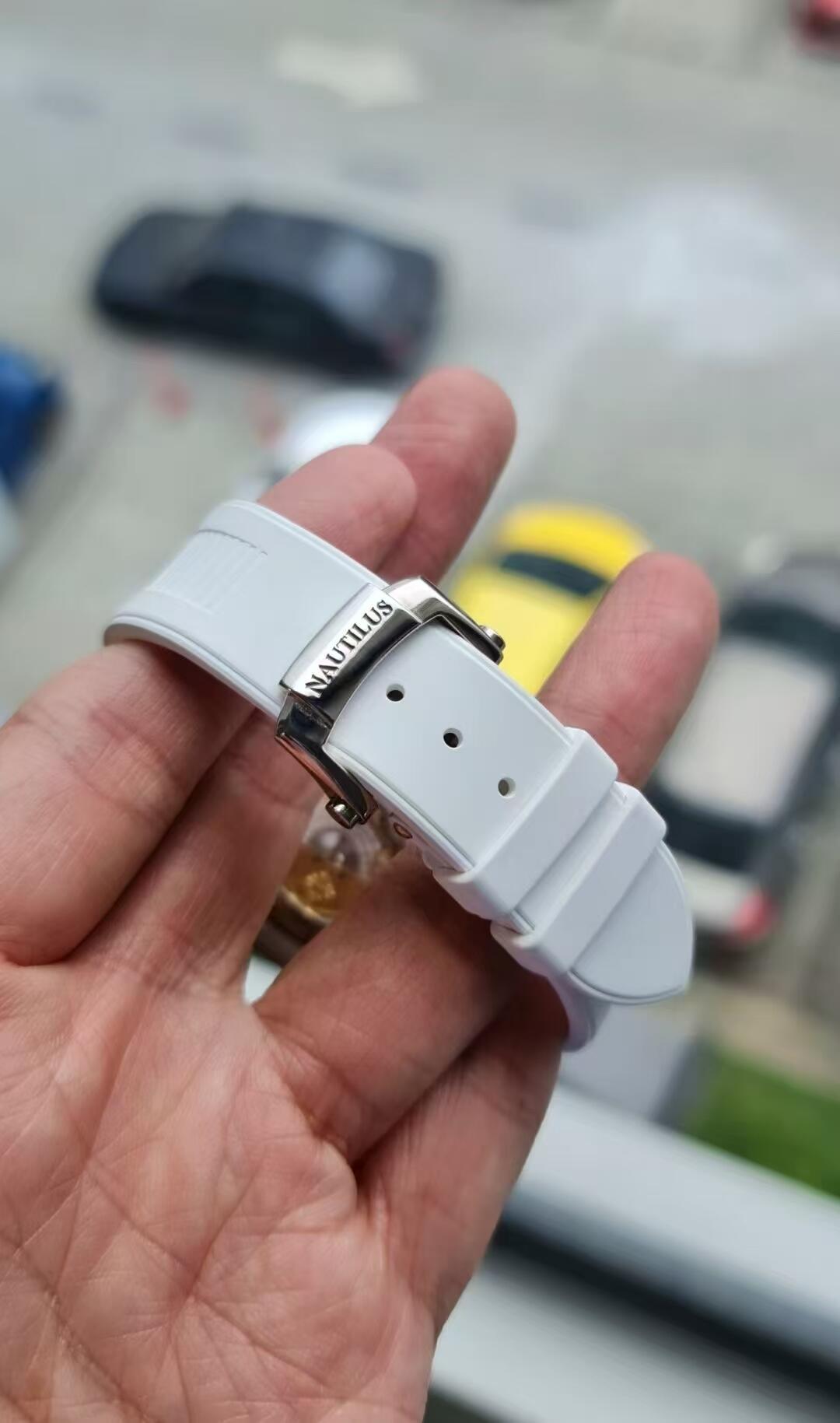 Paired with a white rubber strap, the watch offers modern versatility while maintaining the Nautilus’s iconic porthole-inspired case and horizontally embossed dial. A perfect combination of classic luxury and contemporary style, ideal for collectors seeking understated elegance with advanced complications.